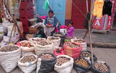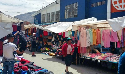 Siste dagen i Tarma, torsdag var det enda markedsdag i byen slik det var da vi bodde der for så lenge siden. Men mye var forandret. Slike boder som sees på dette bildet med klær, sko og annet fantes ikke den gangen. Men frukt og grønnsakene og ikke minst potetene var der, men lite lå på bakken med sekker under seg slik det var vanlig før. Godt å se at det var utvikling også på det området. Flere gater rundt markedshallen var stengt for biltrafikk for å gi plass til alle salgsbodene.