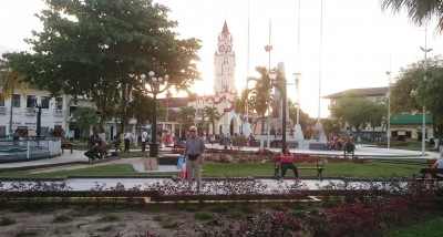 Bilder fra Plaza de Armas i Iquitos. Bak sees den katolske kirken og på motsatt side er kommune- og fylkeshuset i byen. Slik ble alle disse hoved parkene i Peru designet helt fra spanjolenes kolonisering i Sør-Amerika.