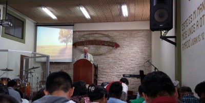 Våre venner hadde lagt opp et ganske tett program for oss i sine respektive sammenhenger, både møter og pastorspar- og ledersamlinger. Her taler John i en karismatisk baptistkirke der det dansk-peruanske misjonærparet har tilknytning.